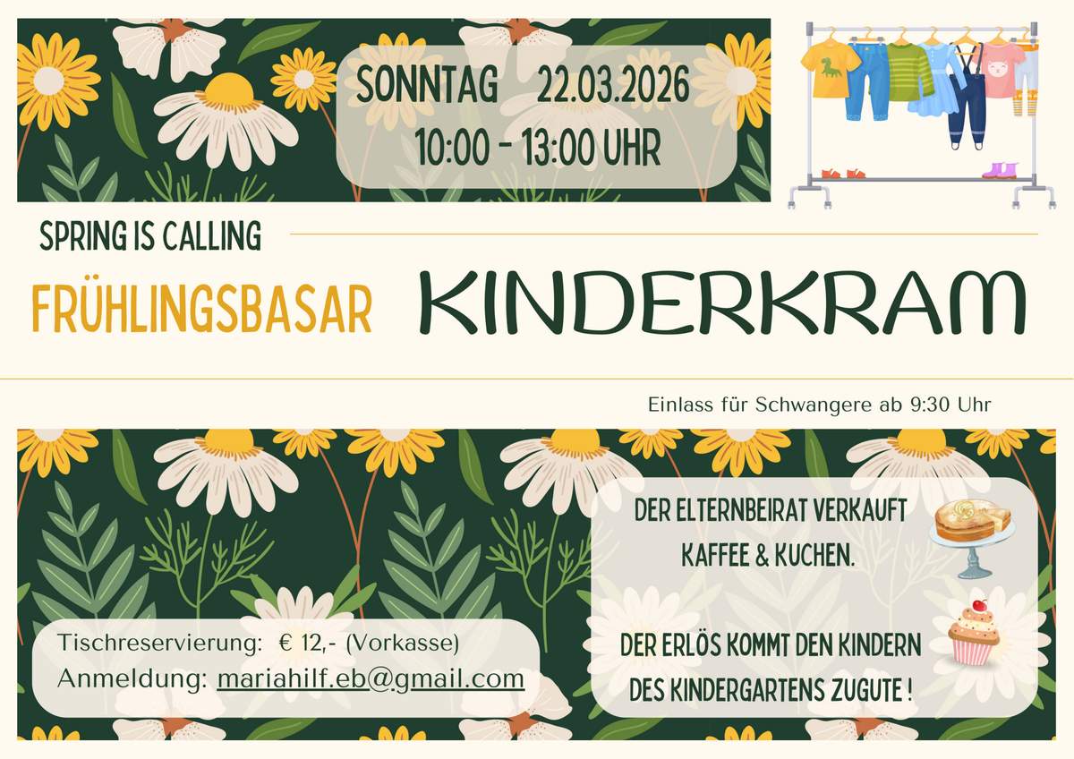 Pfarrheim Maria Hilf Wunderburg 4, Bamberg, Bayern, DeutschlandAlles rund ums Kind. Der Frühlingsbasar des Kindergartens Maria Hilf am Sonntag den 22.03.2026. Der Elternbeirat verkauf Kaffee und Kuchen. Der Erlös kommt den Kindern des Kindergartens zugute. Zeit: 10:00-13:00 […]