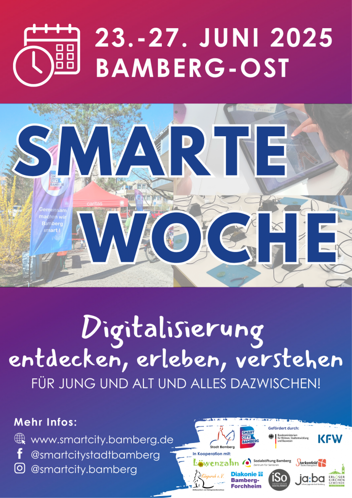 Die Smarte Woche Bamberg-Ost findet vom 23. bis zum 27. Juni 2025 als eine Zusammenarbeit von Smart City Bamberg mit Einrichtungen vor Ort statt: dem Mehrgenerationenhaus Känguruh, dem Stadtteilzentrum Löwenzahn, dem Quartiersbüro am Tivolischlösschen und dem Jugendtreff Ost. In allen vier Einrichtungen werden interaktive Workshops, spannende Vorträge und Mitmach-Aktionen angeboten, bei denen Digitalisierung hautnah erlebt und selbst ausprobiert werden kann. Alles zum Programm: www.smartcity.bamberg.de.