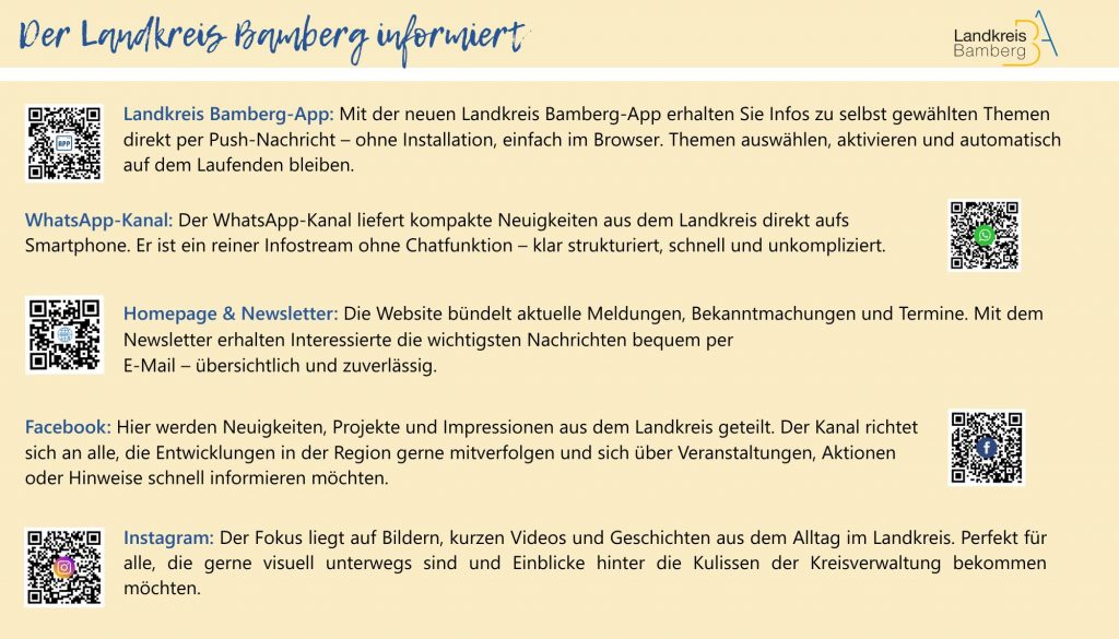 Der Landkreis Bamberg baut seine digitale Kommunikation weiter aus und bietet zwei neue Wege, um zuverlässig und schnell über aktuelle Themen informiert zu bleiben. Ergänzend zu den bestehenden Kanälen stehen ab sofort ein WhatsApp-Kanal sowie eine neue Progressive Web-App (PWA) zur Verfügung. Beide Angebote ergänzen sich und richten sich an unterschiedliche Nutzungsgewohnheiten.