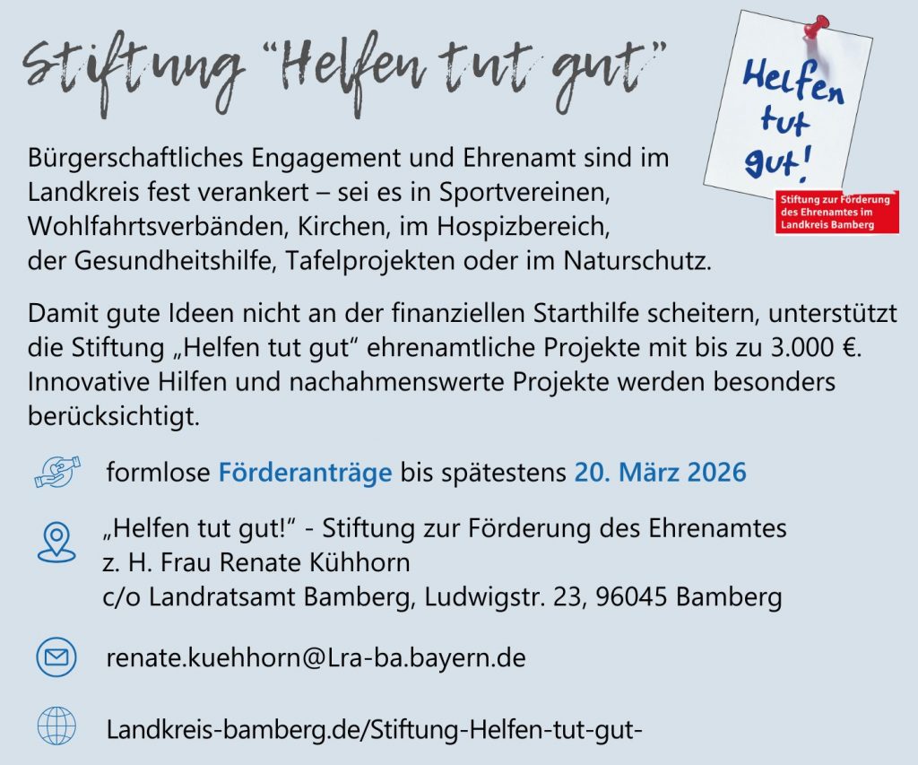 Damit gute Ideen nicht an der finanziellen Starthilfe scheitern, unterstützt die Stiftung „Helfen tut gut“ ehrenamtliche Projekte mit bis zu 3.000 Euro. Innovative Hilfen von Bürgern für Bürger und nachahmenswerte Projekte werden besonders berücksichtigt. Förderanträge können bis spätestens 23. März 2026 formlos gestellt werden an: