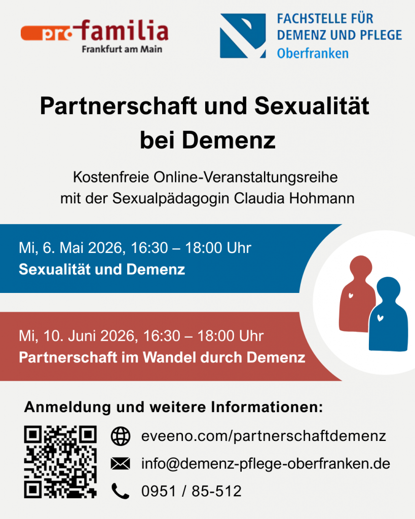 Jeweils mittwochs, am 6. Mai sowie am 10. Juni 2026, von 16:30 bis 18:00 Uhr, lädt die Fachstelle für Demenz und Pflege Oberfranken ein zu zwei kostenfreien Online-Vorträgen rund um die Themen Sexualität, Partnerschaft und Pflege im Kontext von Demenz.