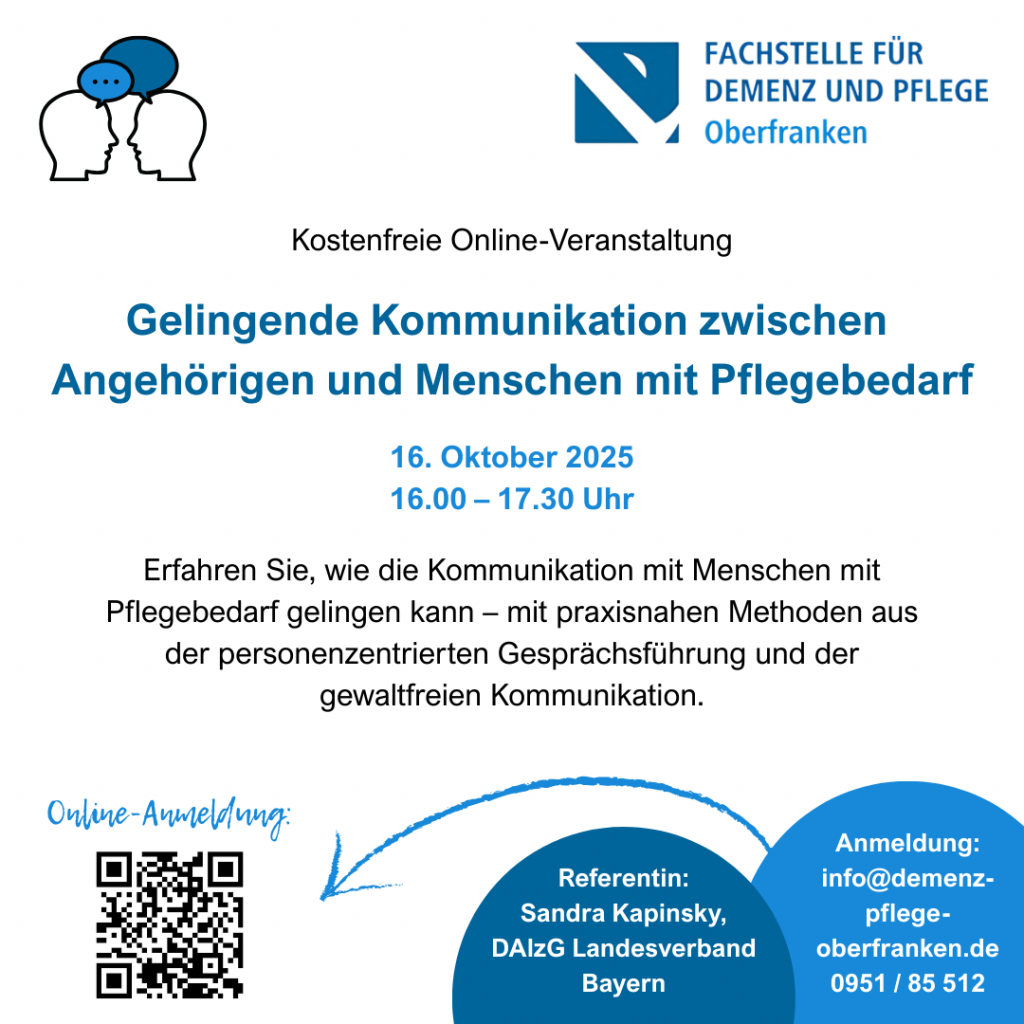 Die Fachstelle für Demenz und Pflege Oberfranken lädt zu einer kostenfreien Online-Veranstaltung zur gelingenden Kommunikation zwischen Angehörigen und pflegebedürftigen Menschen am 16. Oktober 2025, von 16.00 bis 17.30 Uhr ein. Die Veranstaltung richtet sich an pflegende Angehörige, Fachkräfte und Interessierte.