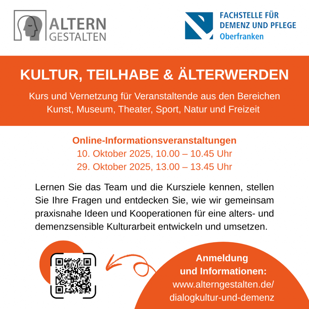 Ab Oktober 2025 startet der kostenfreie Online-Kurs „Kultur, Teilhabe & Älterwerden“ für Gestalterinnen und Gestalter von Kultur-, Freizeit-, Sport- und Naturerlebnissen. Das Angebot ist eine Kooperation der bayerischen Fachstellen für Demenz und Pflege in Ober-, Mittel- und Unterfranken, Oberbayern und Schwaben und Curatorium Altern gestalten. Der Kurs vermittelt praxisnahe Ansätze und Methoden für die Planung und Umsetzung von Veranstaltungen, die ein sensibles und inklusives Umfeld für hochaltrige Menschen und Menschen mit Demenz schaffen.