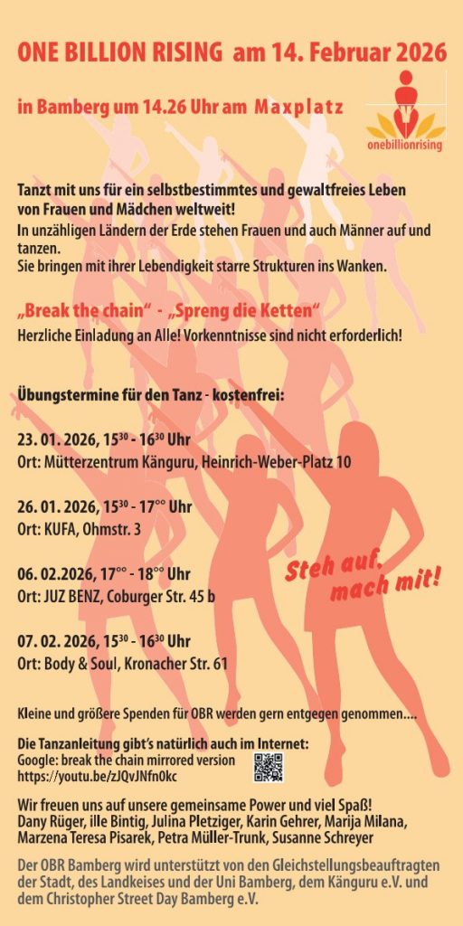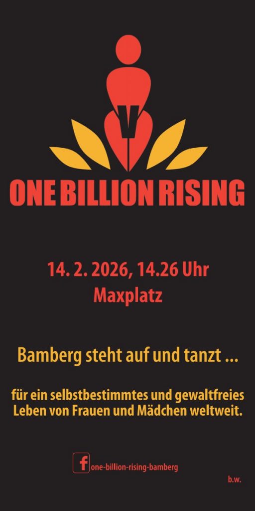 „One Billion Rising“ ist ein weltweiter Aktionstag für ein Ende der Gewalt an Frauen und Mädchen, für weltweite Solidarität und gegen Unterdrückung und Ausbeutung. Am 14. Februar 2026 um 14:26 Uhr tanzen auch in Bamberg wieder Frauen, Jugendliche und solidarische Männer auf dem Maxplatz für ein selbstbestimmtes und gewaltfreies Leben von Frauen und Mädchen überall auf der Erde.