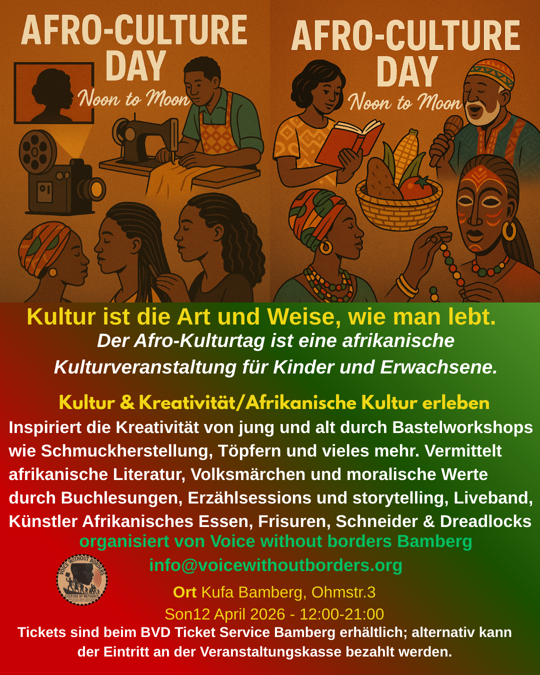 Der Afro-Kultur-Tag: Noon to Moon ist eine energiegeladene, familienfreundliche Feier des reichen und vielfältigen afrikanischen Kulturerbes tagsüber mit Partystimmung am Abend. Im Herzen Bambergs strotzt diese afrikanisch inspirierte Veranstaltung vor Farbe, Rhythmus, Lachen und Verbundenheit und vereint das Beste aus Musik, Tanz, Essen, Mode, Literatur, Kunst und Freude zu einem unvergesslichen Erlebnis.