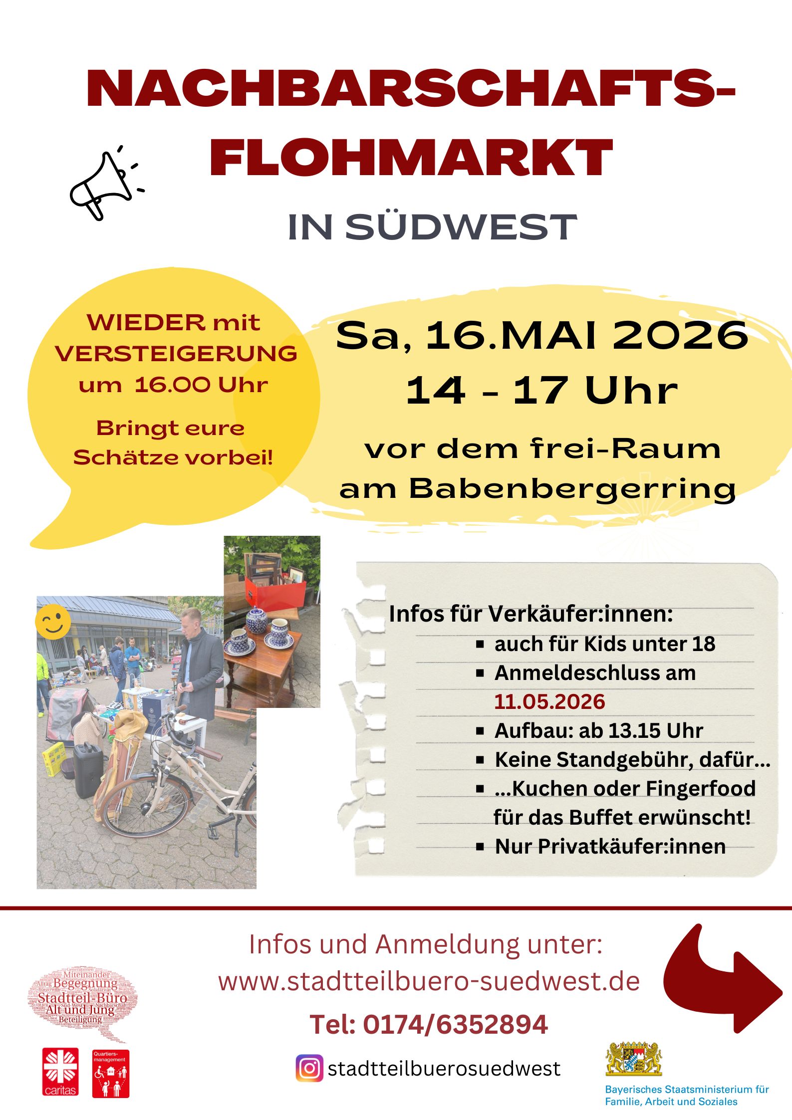 Rund um den frei-Raum am Babenbergerring 71 im Stadtteil Südwest findet am Samstag, 16.05.2026 von 14.00 – 17.00 Uhr ein Nachbarschaftsflohmarkt statt. Ausgediente, aber noch brauchbare Gegenstände erwerben, beim Handeln mit anderen Menschen ins Gespräch kommen, das ein oder andere nützliche Ding finden, – das Alles ist möglich beim Nachbarschaftsflohmarkt für Alt und Jung. Außerdem gibt es Kaffee, Getränke und Kuchen und dieses Jahr auch wieder eine Versteigerung. Um 16.00 Uhr kommen besondere Gegenstände unter den Hammer. Der Erlös aus der Versteigerung ist für die Stadtteilarbeit in Südwest.