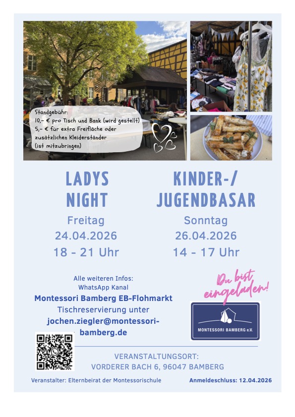 Ladys Night - Kleiderbasar - im Schulhof der Montessori-Sekundarstufe in Bamberg Eintritt frei Standgebühr: 10€ pro Tisch - 5€ für extra Freifläche oder zusätzlichen Kleiderständer Tischreservierung unter jochen.ziegler@montessori-bamberg.de Anmeldeschluß: 12.04.2026