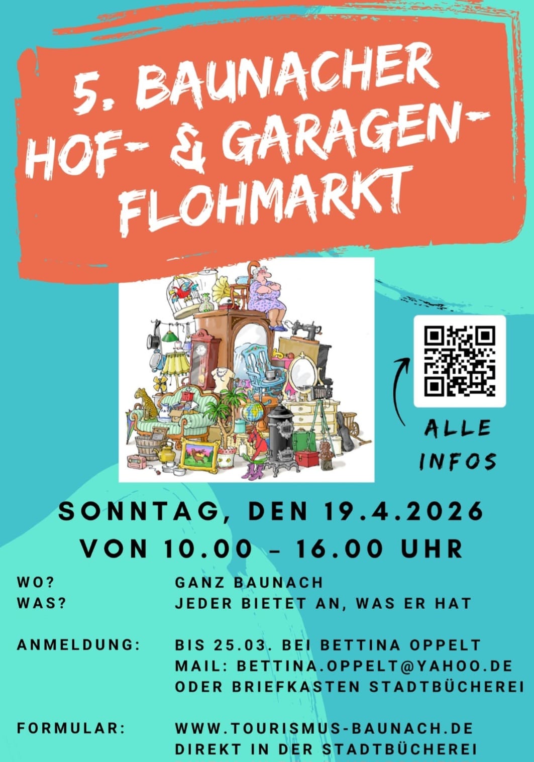 Hof- und Garagenflohmarkt in 96148 Baunach - super auch mit dem Zug erreichbar! Zahlreiche Privathaushalte verkaufen Haushalt, Trödel, Kleidung, Hobby, Sport, Kindersachen, etc. Vor Ort oder über die sozialen Medien zu einem späteren Zeitpunkt auch ein Übersichtsflyer erhältlich, Anmeldephase läuft aktuell noch. Verkaufen kann nur, wer in Baunach wohnt - oder sich dort bei Familie […]