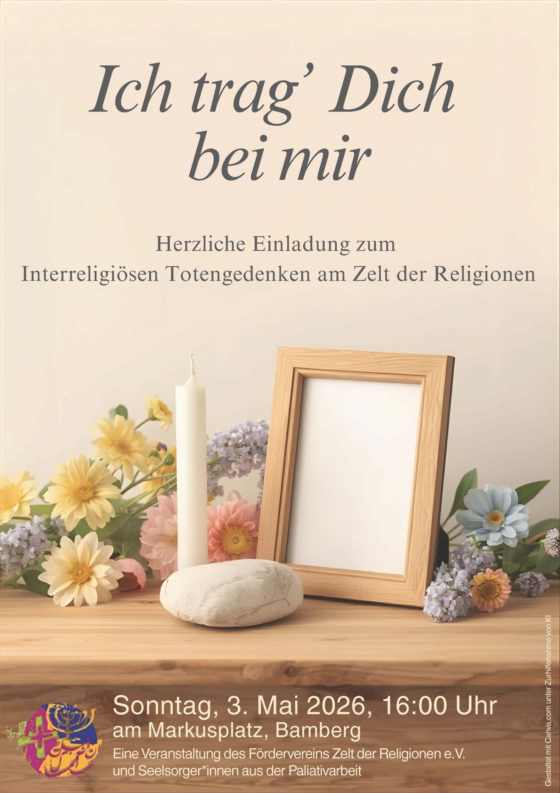 Am 3. Mai 2026 um 16 Uhr findet im Zelt der Religionen am Markusplatz in Bamberg ein interreligiöses Totengedenken statt. Unter dem Motto: Ich trag´ dich bei mir, wollen wir interreligiös unseren Verstorbenen gedenken. Veranstaltet wird dieses Gedenken vom Zelt der Religionen in Zusammenarbeit mit Seelsorger*innen aus der Palitivarbeit Bamberg.
