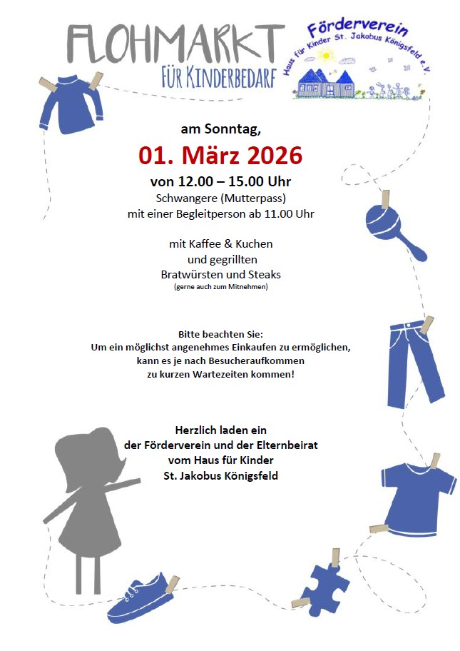 Im Haus für Kinder St. Jakobus Königsfeld, Schulstraße 11, findet am Sonntag, 01.03.2026 von 12 bis 15 Uhr ein Flohmarkt für Kinderbedarf statt. Es können günstig Kinderkleidung, Kinderschuhe, Autositze, Spielsachen, Bücher uvm. erworben werden. Schwangere haben bereits ab 11 Uhr Einlass. Es gibt Bratwürste und Steaks sowie Kaffee und Kuchen. Der Elternbeirat und der Förderverein […]