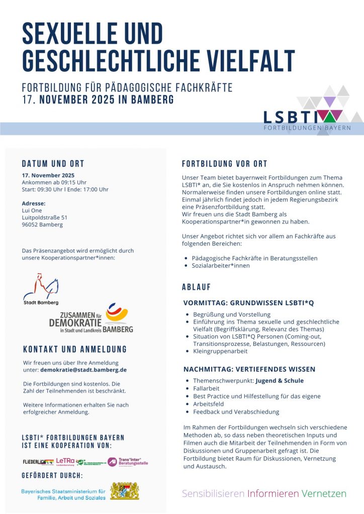 Ein eintägiger Workshop am 17.11.2025 von 9:30–17:00 Uhr im Lui One Bamberg. Zielgruppe: pädagogische Fachkräfte. Inhalte: LSBTI*Q-Themen, Coming-out, Transition, Praxisbeispiele. Anmeldung bis 12.11.2025. Kostenfrei.
